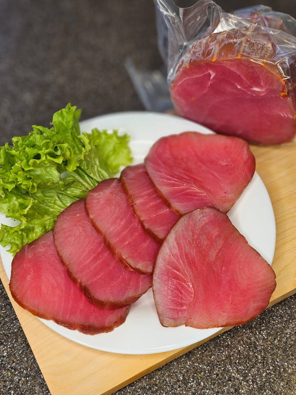 Натуральный тунец холодного копчения с плотной текстурой и насыщенным вкусом. Идеален для нарезки, закусок и праздничного стола.